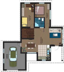 此款木屋設(shè)計為兩層樓,木房屋總面積100米²;一個外部車庫加住宅四室和廚房住宅。一樓的生活空間有53平方米,二樓47米²,車庫-