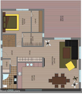 此款木屋設(shè)計為兩層樓,木房屋總面積100米²;一個外部車庫加住宅四室和廚房住宅。一樓的生活空間有53平方米,二樓47米²,車庫-
