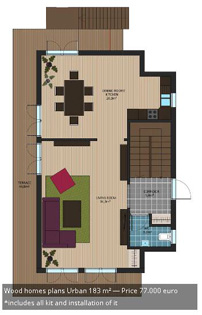 此款木屋設(shè)計為兩層樓,木房屋總面積183米²;一樓一個寬敞的內(nèi)部開放式結(jié)構(gòu),一樓配備客人衛(wèi)生間,陽臺和開放的屋頂露臺